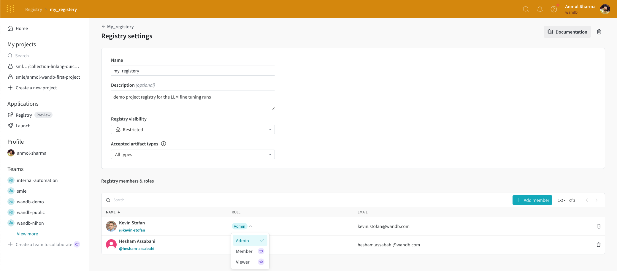 W&B Registry を使用して、モデルアーティファクトを追跡、整理、利用します。詳細は Registry docs を参照してください。