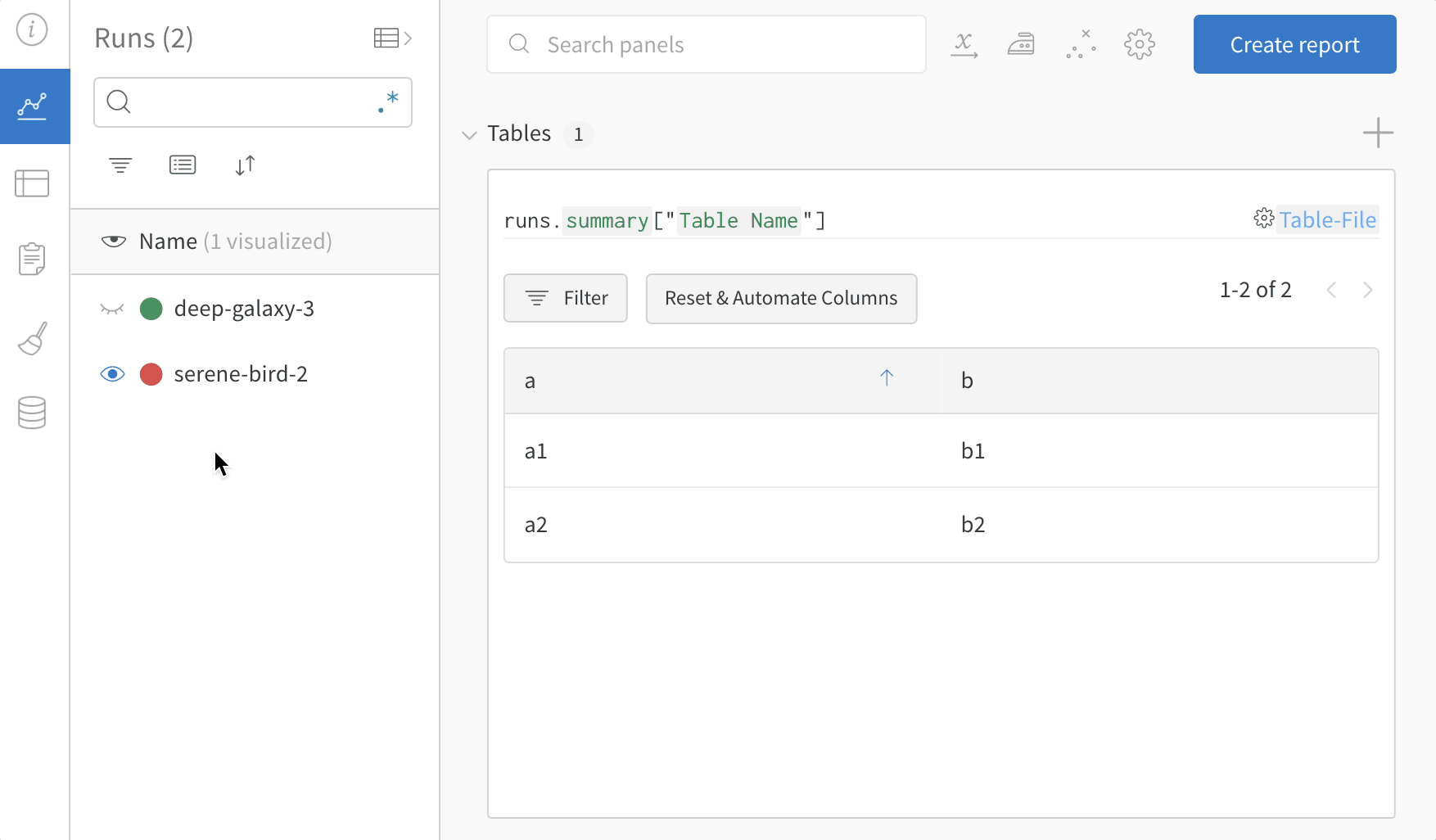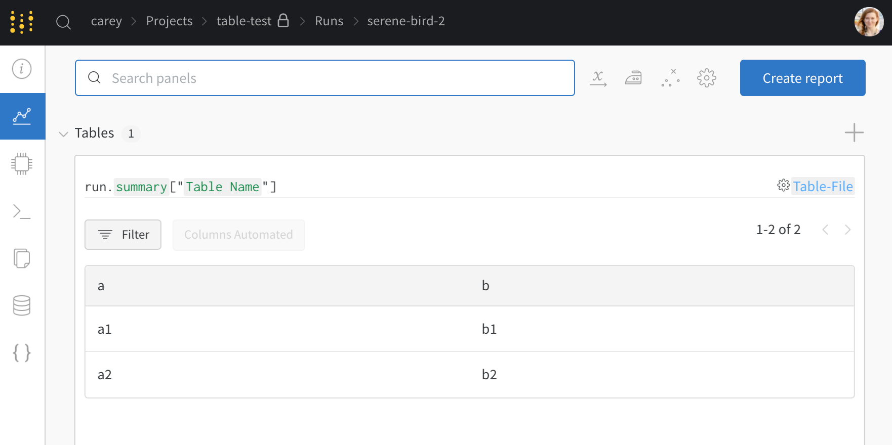 - プロジェクト ワークスペースで run の名前を選択します。それぞれのユニークなテーブル キーに対して新しいパネルが追加されます。