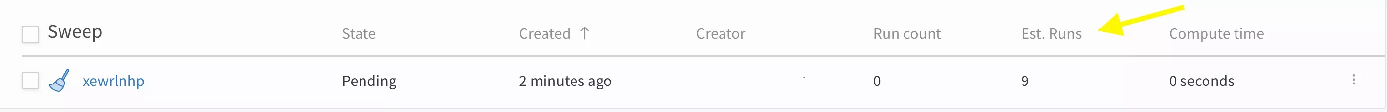 이 경우 데카르트 곱은 9와 같습니다. W&B는 이 값을 App UI에 예상 Run 수 (Est. Runs)로 표시합니다.